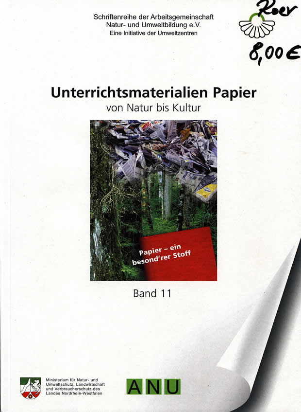 Unterrichtsmaterialien PAPIER. Von Natur bis Kultur Barbara Maue, ANU Schriftenreihe Band 11 264 Seiten, DIN A 4, 8 Euro plus 2 Euro Porto/ Verpackung Die umfangreiche DIN A 4 Handreichung enthält viele Arbeitsblätter, Folienvorlagen, Hintergrundinformationen und Ablaufvorschläge. Das Thema Papier wird in 7 Bausteinen mit mehreren Einheiten behandelt: Papier-Geschichte, über den Herstellungsprozess früher und heute, den Wald als "Rohstofflieferanten" und mehr bis hin zu einem Papier-Parcour mit 20 Lernstationen und konkreten Aktionsvorschlägen zum Thema "Nachhaltiger Papiereinsatz". Direktbezug über: Arbeitsgemeinschaft Natur- und Umweltbildung NRW e.V. (ANU) Biologische Station Recklinghausen, Im Höltken 11, 46286 Dorsten Tel. 02369 - 7 75 05, Fax 02369 - 7 76 07 Email: b.maue@gmx.de |