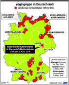 zur Vogelgrippe Die afp-Animation informiert über: - Verbreitung der Vogelgrippe weltweit - Wandlungsfähigkeit von Vogelgrippe-Viren - Todesfälle bei Menschen durch Vogelgrippe - Symtome beim Menschen nach Infektion mit Vogelgrippe-Viren Startseite des Angebots [afp] |