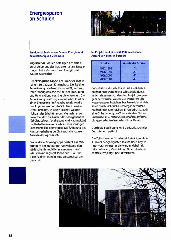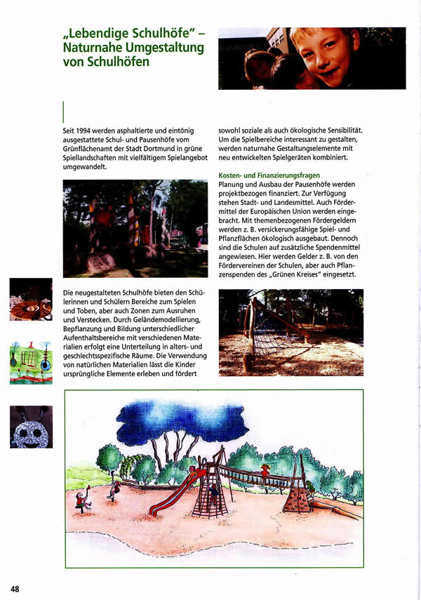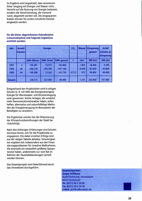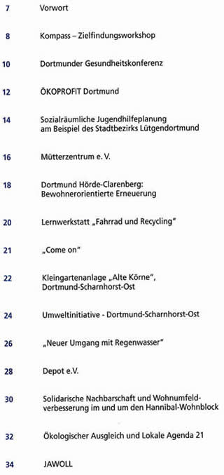 Beispiele nachhaltiger Entwicklung": Aktionen und Projekte zur Agenda 21 61 Seiten, DIN A 4, farbig, KOSTENLOS Themen u.a.: Zielfindungs-Workshop, Gesundheitskonferenz, Ökoprofit, Jugendhilfeplanung, bewohnerorientierte Erneuerung; Fahrrad und Recycling; Regenwassernutzung; solidarische Nachbarschaft und Wohnumfeldverbesserung; Energiesparen in Wohngebäuden und in Schulen; Prävention von Kinderunfällen; ökologische Umgestaltung von Bächen, Schulhöfen und Spielplätzen; ökologisch orientierte Waldpflege; Agenda 21 und Schule Bezug über: Agenda-Büro, Helga Jänsch/ Christoph Löchle, Südwall 2-4, 44135 Dortmund Telefon (0231) 50 22067, Telefax (0231) 50 26447 agenda@dortmund.de Download der Broschüre [pdf, 880 KB] |